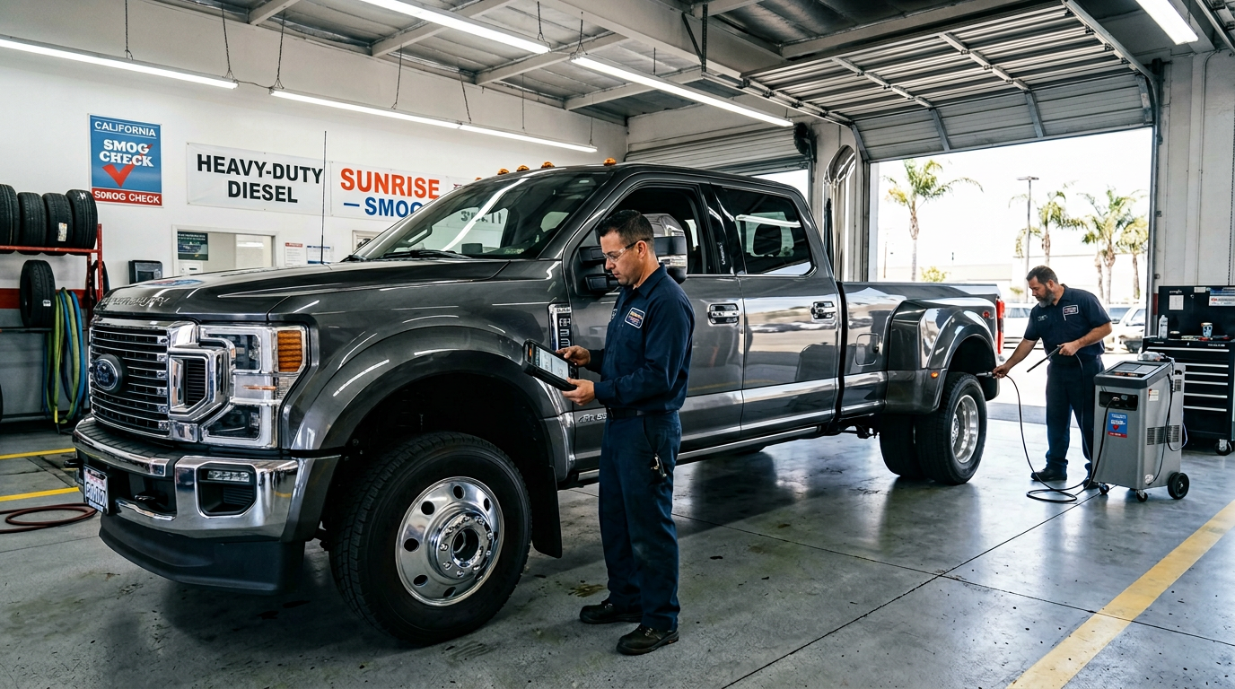Emissions testing for diesel vehicles, commercial trucks and RVs up to 14,500 lbs GVWR. OBD + visual inspection, done right.